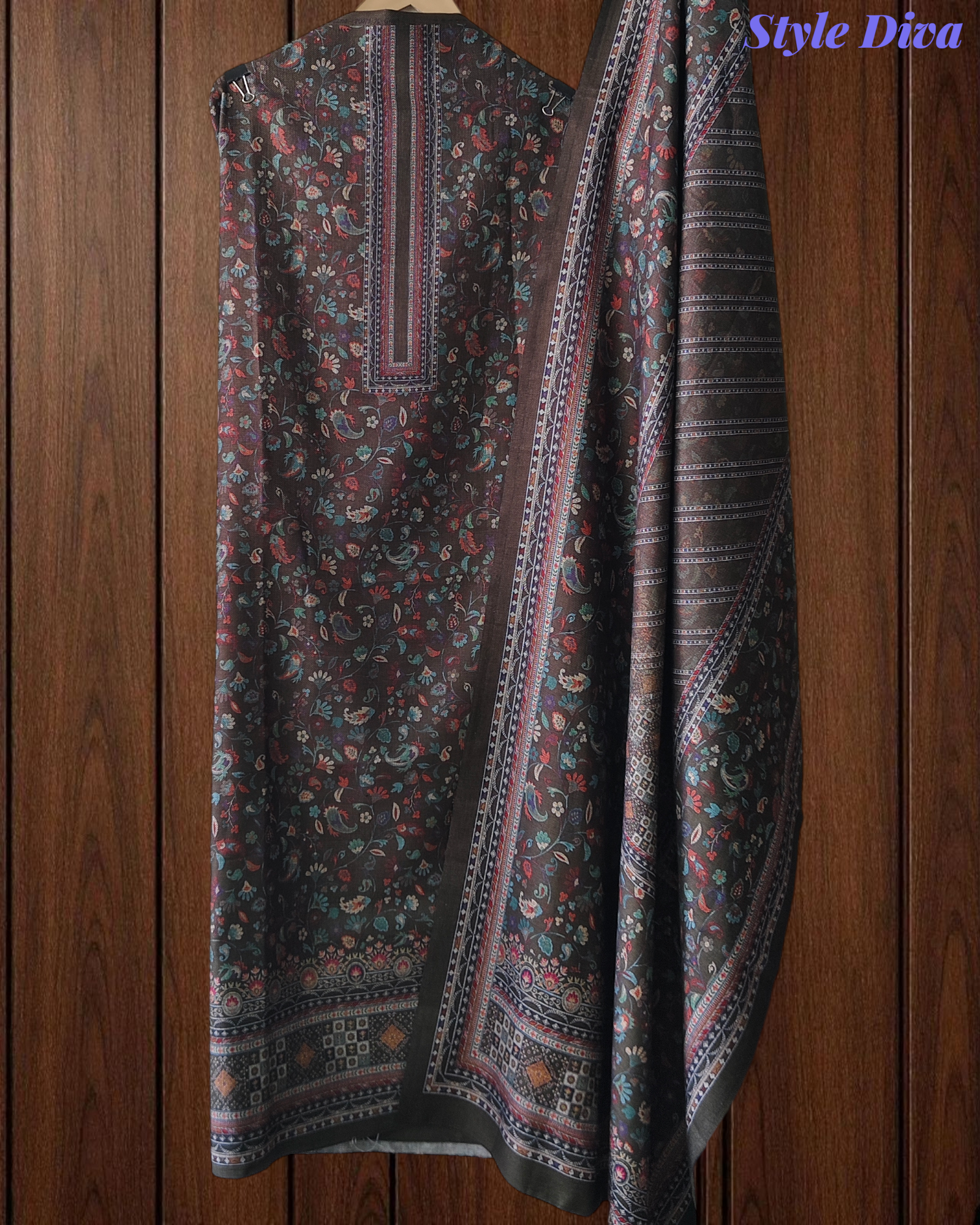 This premium pashmina floral digital printed suit set offers the perfect blend of warmth, comfort, and elegance. Paired with a solid color bottom fabric, it creates a classy winter ensemble suitable for everyday wear and light festive gatherings.