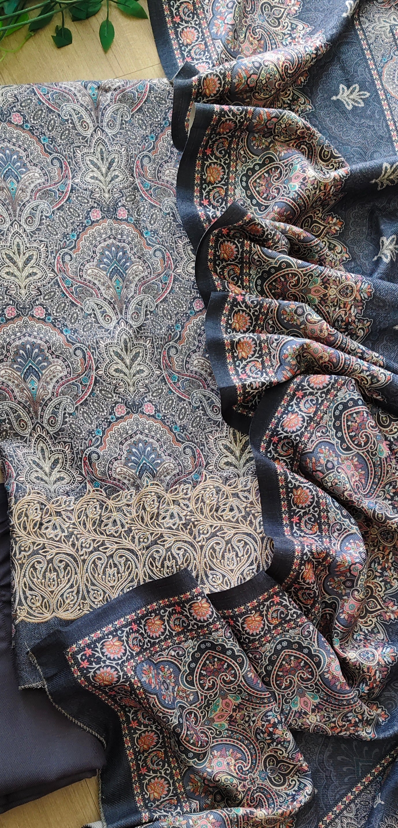 Elevate your winter wardrobe with this elegant Pashmina un-stitched suit set, featuring graceful floral prints highlighted by intricate Daman embroidery. Paired with a matching printed dupatta and warm Pashmina fabric, it offers comfort, warmth, and timeless seasonal style.