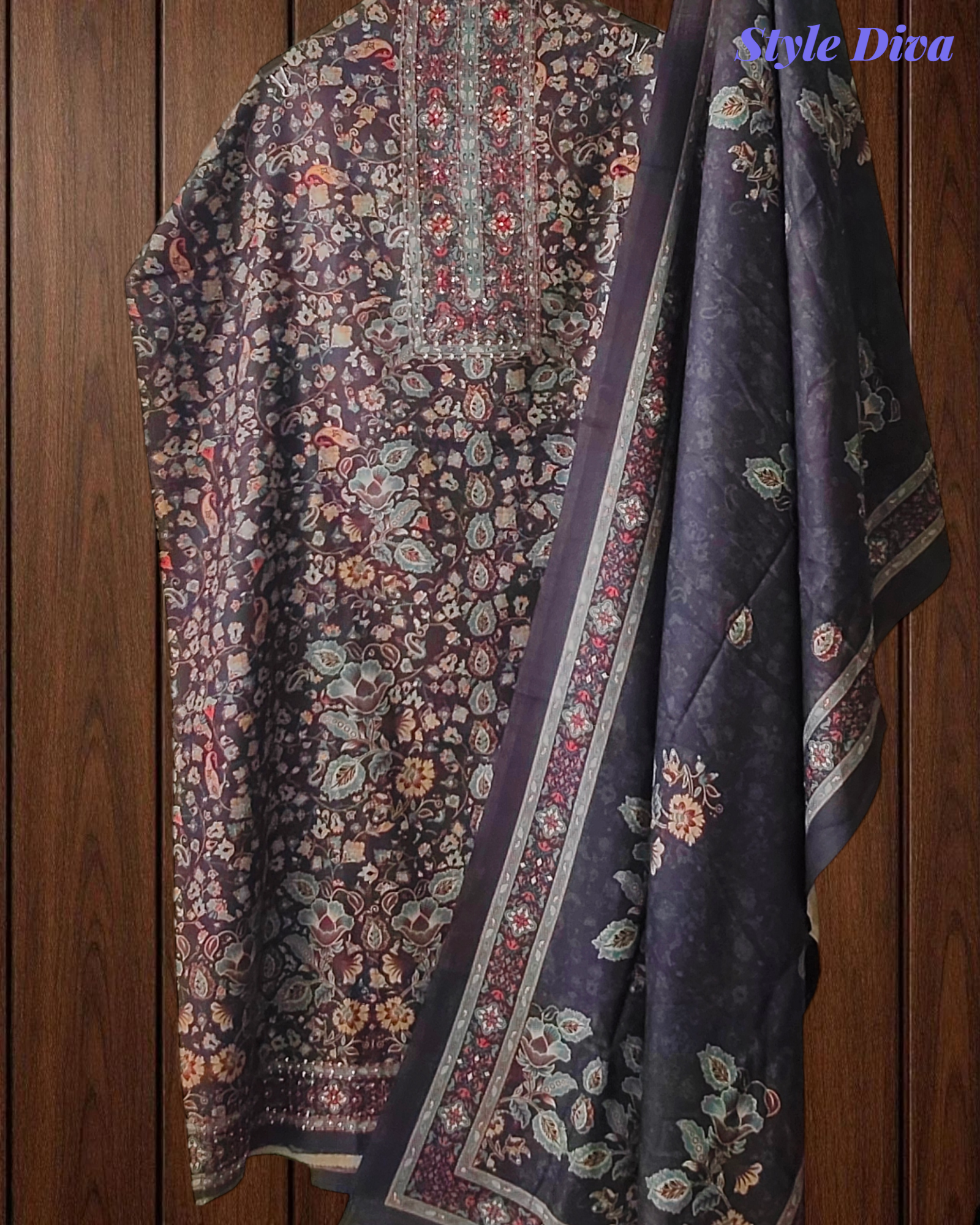 Dupatta: Premium pashmina dupatta with elegant digital prints, adding warmth and graceful appeal